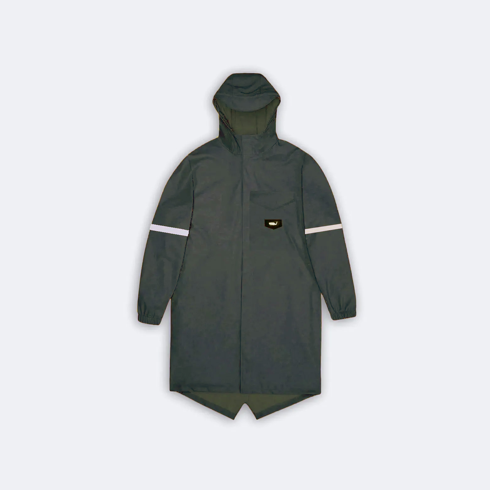A Parka Atero pode ser usada como capa de chuva ou corta vento. Unissex caracterizada por sua estética despojada e bainha em cauda de peixe.